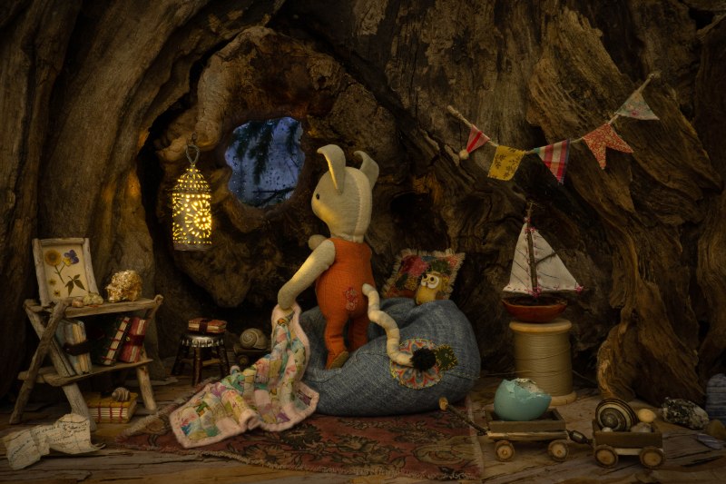 (Insert ecstatic emoji here!) There really couldn’t be a better recognition of my process than this – except from the children who read Rumie! On that front, I am thrilled that some children believe that Rumie is a real creature, living in the woods. I took Rumie’s bedroom set to my book launch and posed a Rumie puppet at the window in the same pose as the scene in the book (see below), and one three year old child said, “But where is the real Rumie?”