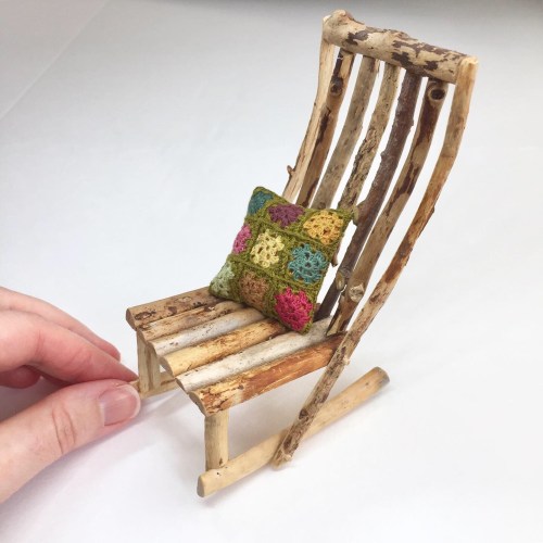 When I make props like a bridge or furniture, I spend lots of time in the woods looking for the right twigs – curved twigs are especially desired! This rocking chair is joined with toothpick dowels (I avoid glue so it looks as rustic as possible). I crocheted this 3cm cushion with a 1mm crochet hook and embroidery floss. You can find it on page 18 of Rumie Goes Rafting.