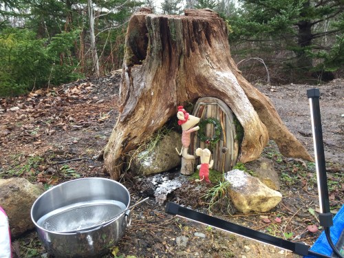 Before I took the stump pieces indoors, I was inspired to take a photo with my practice toys for a Christmas scene, to experiment with icing sugar and a sieve for snow (my next story is set in winter). Even in the middle of the day, I still need to use portable lights to get camera focus in the shadowed areas.