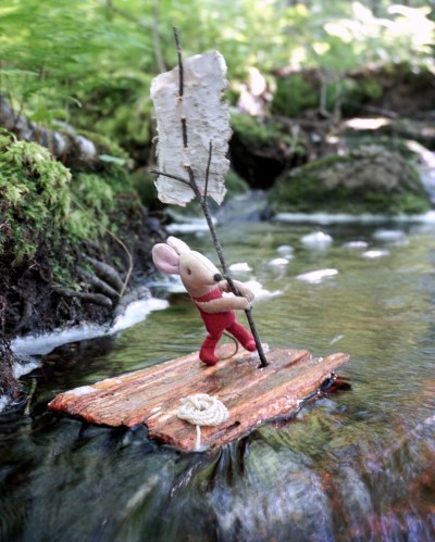 I often wear chest waders, as a lot of my photos are taken from the water. Sometimes I have to sit in the stream to get the right angle. It’s cold, but when I’m creating I don’t notice the temperature or mosquitos! Here, I’m adjusting the position of puppet and props for the scene on page 9 of Rumie Goes Rafting. Working quickly is necessary when you can’t control the sky, so I show up an hour before I know the sun will be in the right position above the trees (something I’ve noted from the prior day or two of test shots), giving myself enough time to set up. When the sun moves into range, I shoot 200-300 photos, hoping to get a lucky shot when the leaves and clouds happen to land in position. No wind is best, but rarely happens in Nova Scotia!
