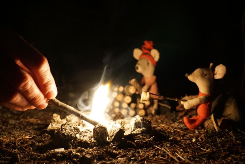 A helping hand from my friend Dave, on a practice shoot when I was experimenting with fire. Tiny fires burn faster with less fuel to keep them going. This one was fuelled with wax and twigs.