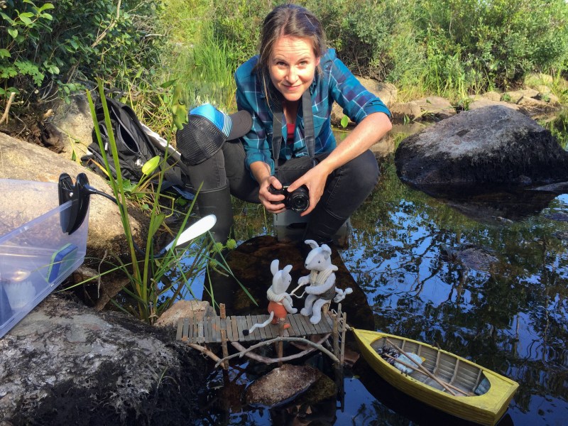 It’s a patient process, but I love collaborating with nature, especially when I’m able to capture the best moments on camera. It doesn’t always happen, and looking back over my photos, sometimes I wish the sun could have been a bit to the right, or a random cloud didn’t appear at the wrong moment, but that’s life – you have to make the most of what’s offered and move on to the next shot. And sometimes amazing things happen you couldn’t possibly plan! Like when a curious frog came along and sat in exactly the right position in my photo, looking on as my puppets readied themselves for a boat ride at the dock. It was a dream moment I had to pinch myself to believe! If you pick up a copy of Rumie Goes Rafting, you can find that very frog on page 33.
